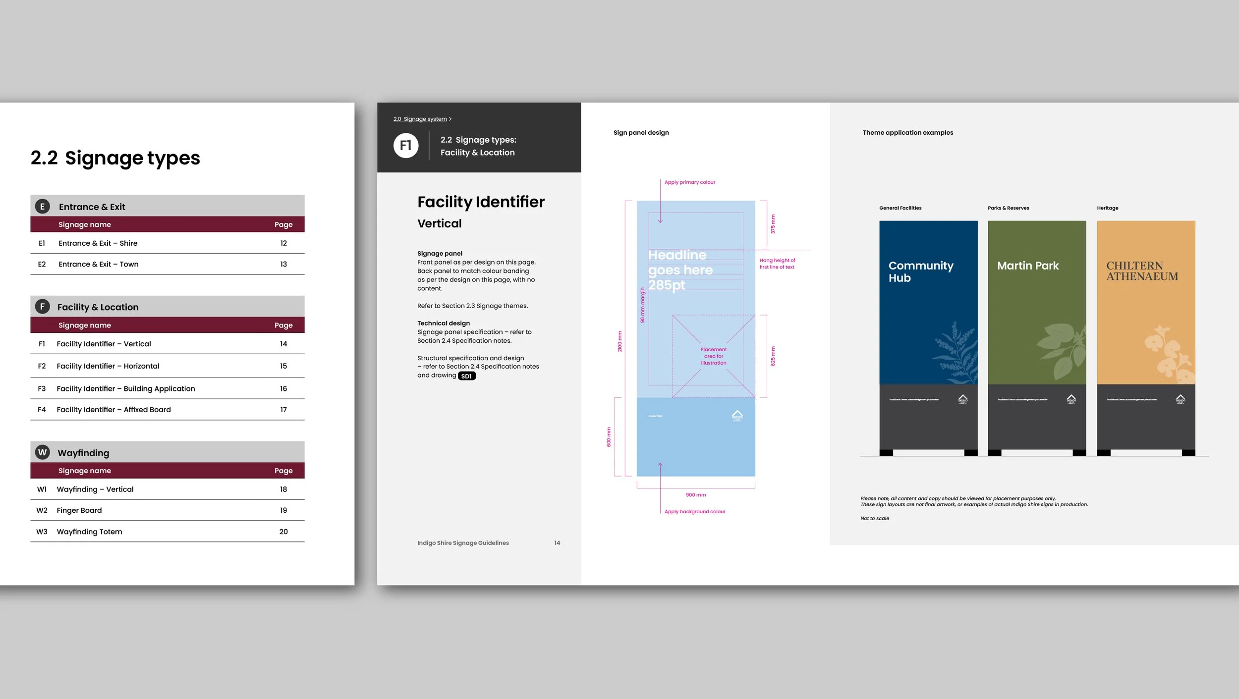 We worked with the Council team to streamline a substantial list of sign types into four key themes - Entry/Exit, General Facilities, Parks & Reserves and Heritage - that could be applied across all categories of signage. We then developed a very comprehensive, step-by-step guide to selecting a category, type and theme for each sign, as well as ‘plug-and-play’ templates for easy production.