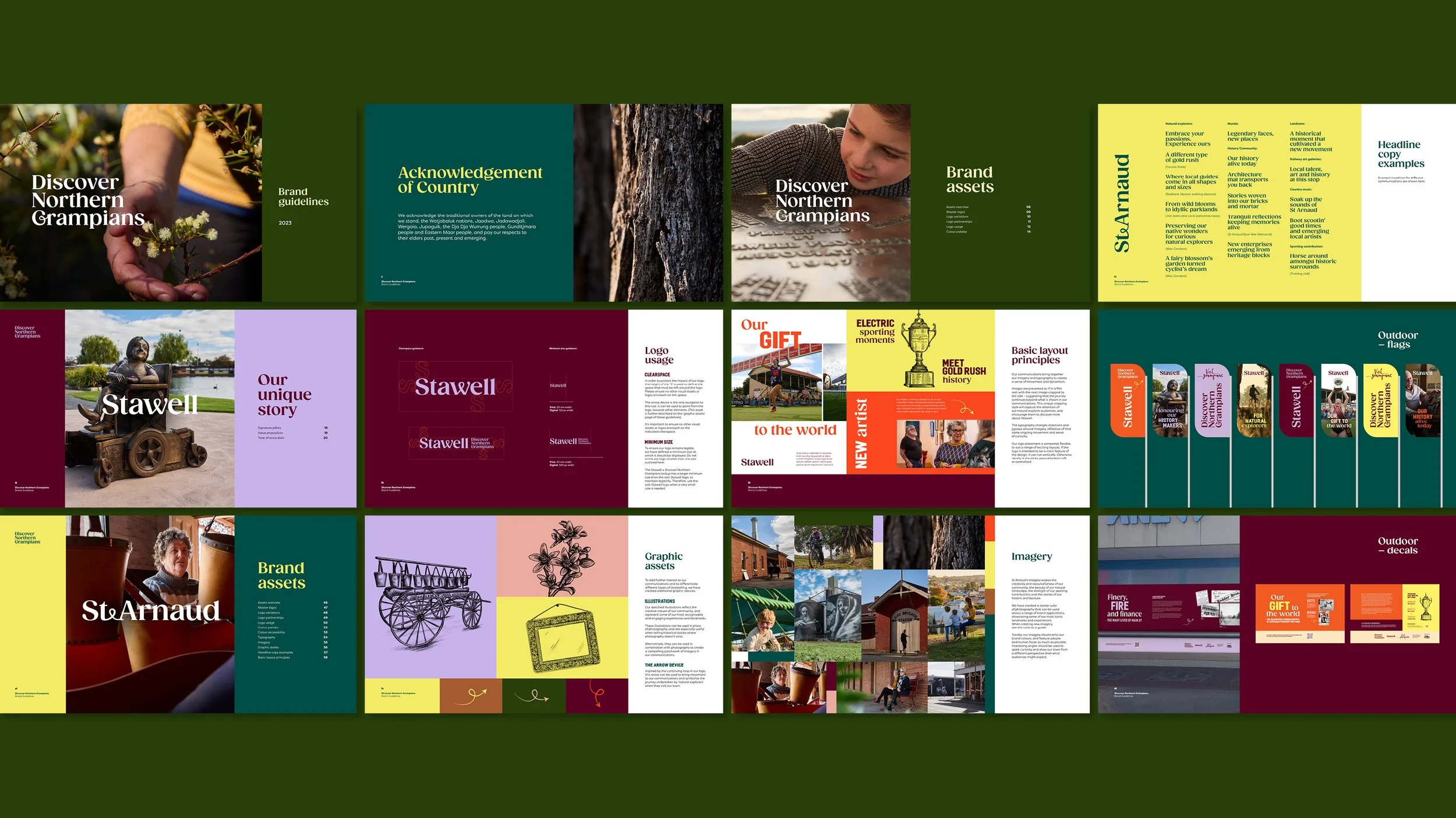The Discover Northern Grampians visitor brand features layered storytelling, combining photography with juxtaposing tone of voice, crafted to feel like ongoing film reels. Further brand personality is added via a suite of illustrations for each town, and a rich but vibrant, and flexible colour palette.